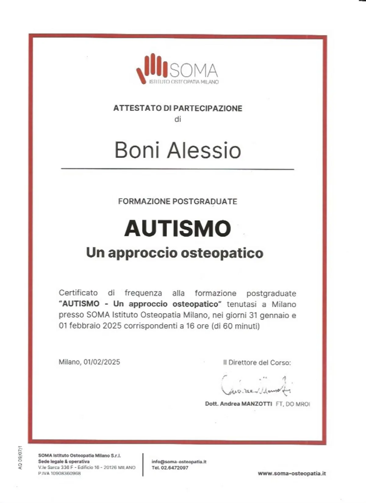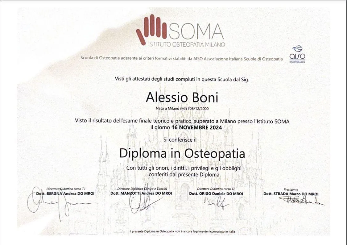 Mi sono rivolto ad Alessio per un trattamento osteopatico a causa di tensioni muscolari e sin dalla prima seduta ho notato un netto miglioramento. Alessio è un professionista preparato, attento e molto disponibile all’ascolto: si prende il tempo per comprendere a fondo il problema e adattare il trattamento alle reali esigenze del paziente. L’ambiente è accogliente e curato, trasmette subito una sensazione di tranquillità. Dopo ogni seduta mi sono sentito più sciolto, rilassato e con una maggiore mobilità. Inoltre, Alessio fornisce consigli utili e molto chiari su postura ed esercizi da fare a casa per mantenere i benefici del trattamento. Consiglio vivamente Alessio a chiunque cerchi un approccio serio, professionale e umano all’osteopatia.Super mi sento decisamente meglio e riesce sempre a darmi una spiegazione a tutti i miei acciacchi grazie Dottor Boni